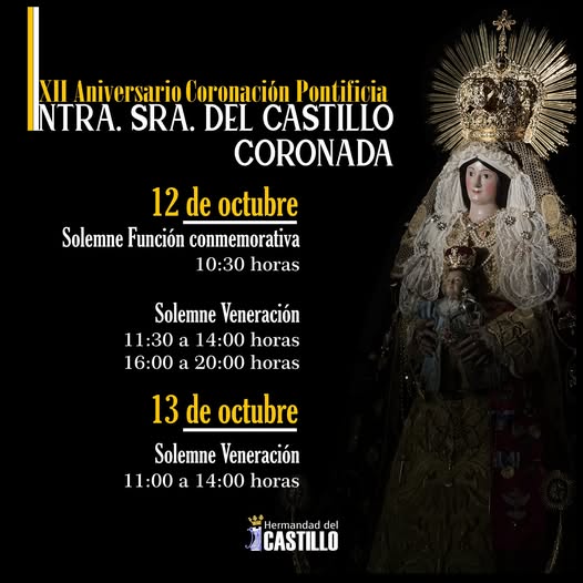 El prรณximo sรกbado, 12 de octubre, tendrรก lugar la Funciรณn conmemorativa del doceavo aniversario de la Coronaciรณn Pontificia de Ntra. Sra. del Castillo y su posterior veneraciรณn.