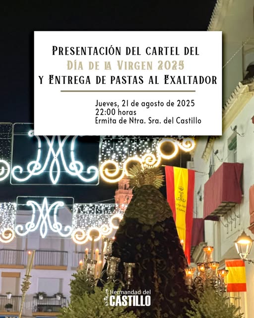 El prรณximo jueves 21 de agosto, a las 22:00 horas, en nuestra Residencia Canรณnica, la Ermita de Ntra. Sra. del Castillo, se llevarรก a cabo la presentaciรณn de la obra que anunciarรก el Dรญa de la Virgen 2025, realizada por el artista @luis_delapura