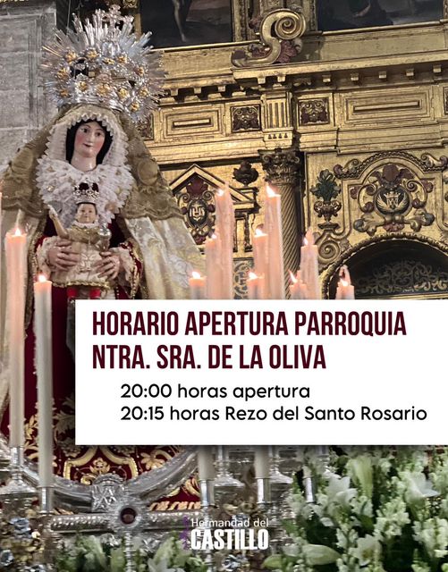Desde esta semana, la Parroquia de Ntra. Sra. de la Oliva permanecerรก abierta desde las 20:00 horas, con el rezo del Santo Rosario a las 20:15 horas, para permitir la visita de nuestra Madre y Patrona durante su estancia en este Templo.