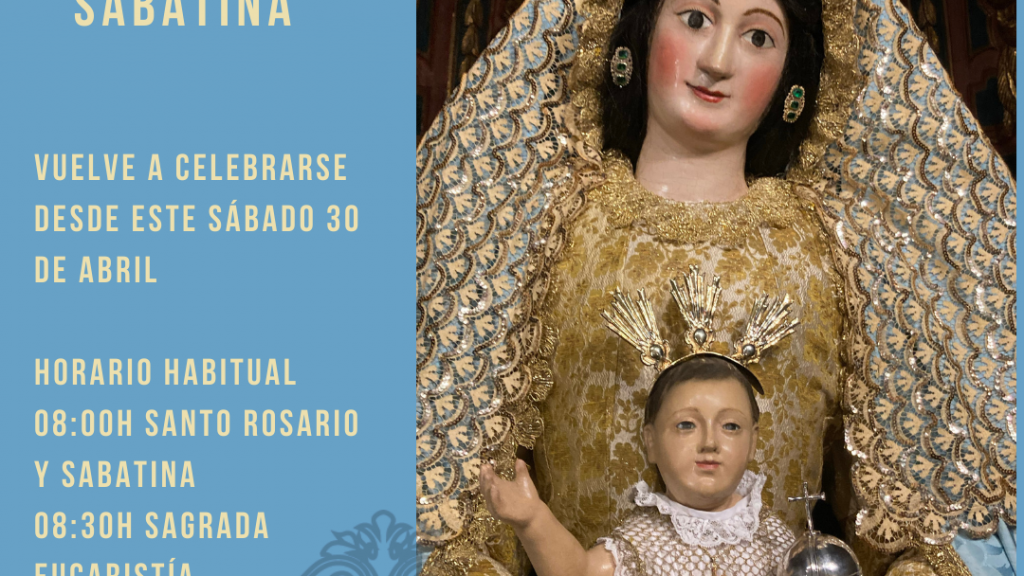Queridos hermanos, desde este próximo sábado 30 de abril, se retomarán en la Ermita del Castillo la celebración de la Santa Sabatina. Recordamos que la celebración de la misma, en su horario habitual, será; 08:00 h Rezo del santo Rosario y de la Sabatina. 08:30 h Sagrada Eucaristía.