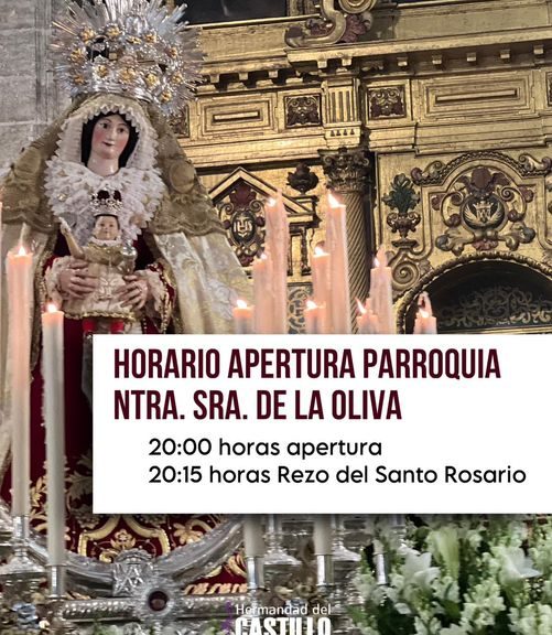 Desde esta semana, la Parroquia de Ntra. Sra. de la Oliva permanecerá abierta desde las 20:00 horas, con el rezo del Santo Rosario a las 20:15 horas, para permitir la visita de nuestra Madre y Patrona durante su estancia en este Templo. #Castillo2024 #Castillo24