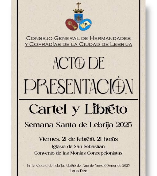 Mañana, Viernes 21 de febrero, tendrá lugar en la Iglesia de San Sebastián (Convento de la Orden de la Inmaculada Concepción), a las 21 horas, la Presentación oficial del libreto y Cartel de la Semana Santa Lebrijana, obra del artista Juan Miguel Martín Mena. #Castillo2025 #Castillo25