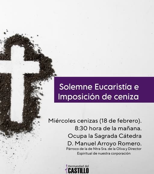 El próximo miércoles 18 de febrero, Miércoles de Ceniza, celebraremos en nuestra residencia Canónica, solemne Eucaristía e imposición de cenizas a las 8.30 horas, siendo oficiada por nuestro Párroco y Director Espritiual, D. Manuel Arroyo Romero. #Castillo2026 #Castillo26
