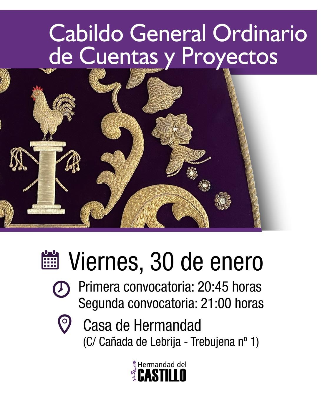 Como recogen nuestras Reglas, el próximo viernes 30 de enero celebraremos Cabildo General Ordinario de Cuentas y Proyectos, en nuestra Casa Hermandad, citando a nuestros hermanos a las 20:45 en primera convocatoria y a las 21:00 en segunda.