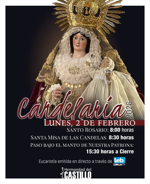 La jornada comenzará a las 8:00 horas con el rezo del Santo Rosario, seguido de la Santa Misa de las Candelas, que será retransmitida en DIRECTO por @lebrijatv.