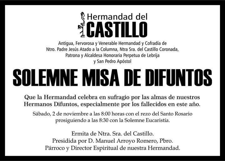 Durante la #Sabatina del próximo sábado 2 de noviembre, esta Hermandad celebrará, en sufragio de las almas de nuestros hermanos y devotos fallecidos, Solemne Misa de Difuntos, siendo presidida por nuestro Director Espiritual y Párroco de Ntra. Sra. de la Oliva, D. Manuel Arroyo Romero, Pbro.